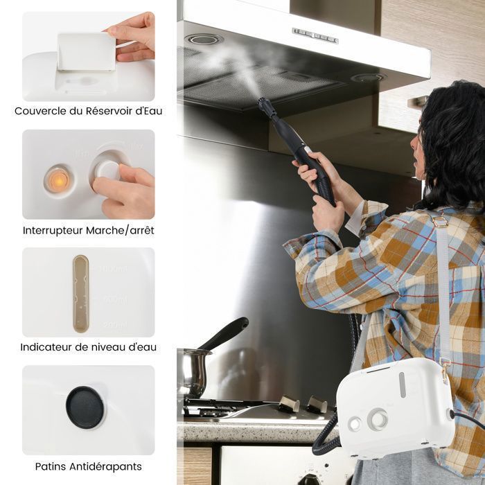 ——Le nettoyeur à vapeur est un outil précieux pour lutter contre les punaises de lit. Efficace, rapide et écologique, il peut éliminer les interstices et les recoins difficiles d’accès pour les agents chimiques——Machine de nettoyage efficace avec pression de vapeur 3 bars et température élevées 180℃ ——12 Accessoires pratiques permettant de s’attaquer facilement à diverses tâches ——Réservoir d’eau de 1 L pour un temps de travail prolongé sans remplissage fréquent ——Préchauffage en 10s et jusqu’à 30 minutes de temps de travail ——Vapeur réglable en 2 niveaux adaptée à différents besoins de nettoyage ——Interrupteur pour ajuster librement en fonction de l’intensité de la tache ——Livré avec un couvercle de réservoir d’eau pour éviter les fuites d’eau ——Conçu avec un interrupteur marche/arrêt pour une utilisation simple ——Indicateur de niveau d’eau pour indiquer quand un remplissage est nécessaire ——Coussinets antidérapants pour éviter les rayures sur le sol ——Câble d’alimentation long 248 cm pour un accès facile aux zones difficiles à atteindre ——Flux de vapeur: 40-220g/min