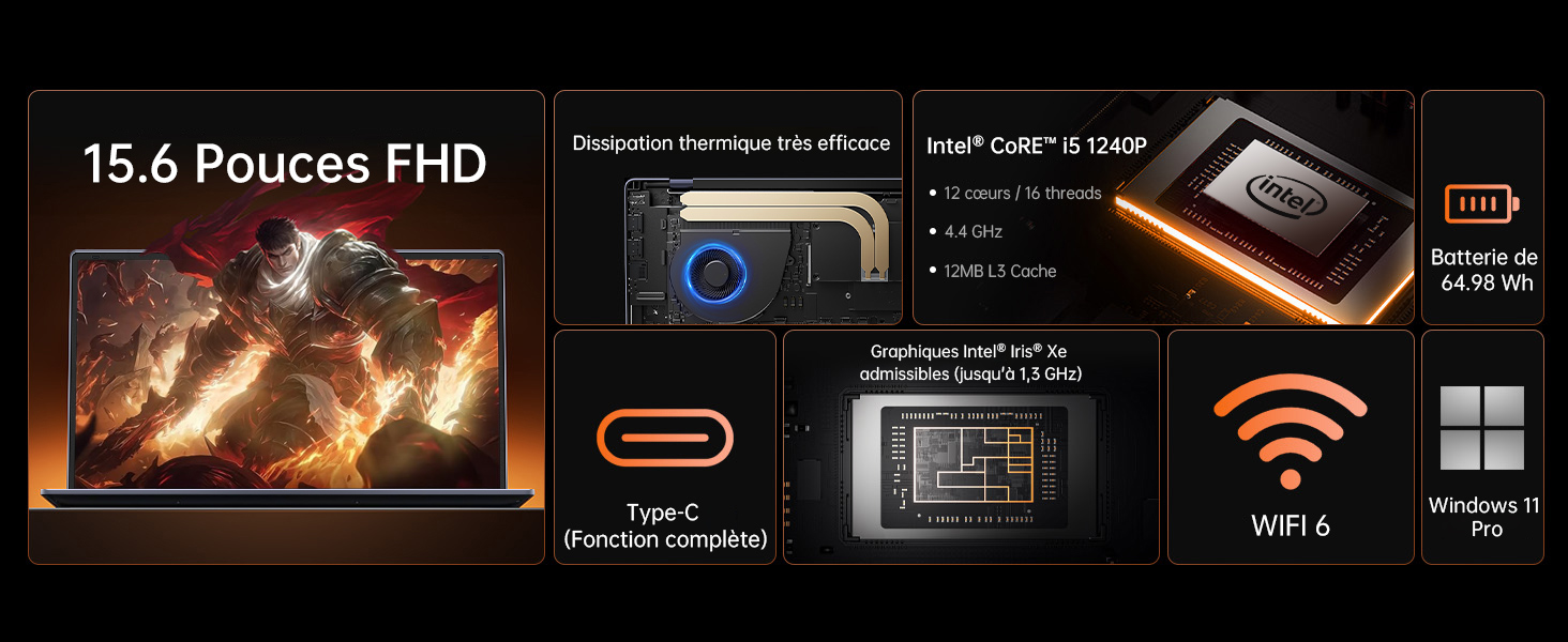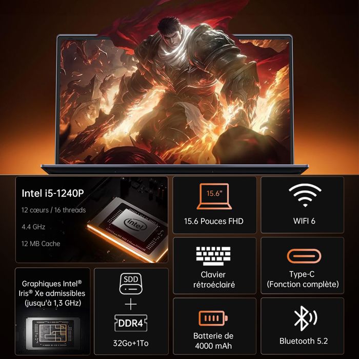 Nom du produit PC Portable Gamer MICREAR 15.6″ FHD, Intel Core i5-1240P 12C/16T 4,4GHz, 32Go RAM 1To SSD, WiFi6, Win11 Pro