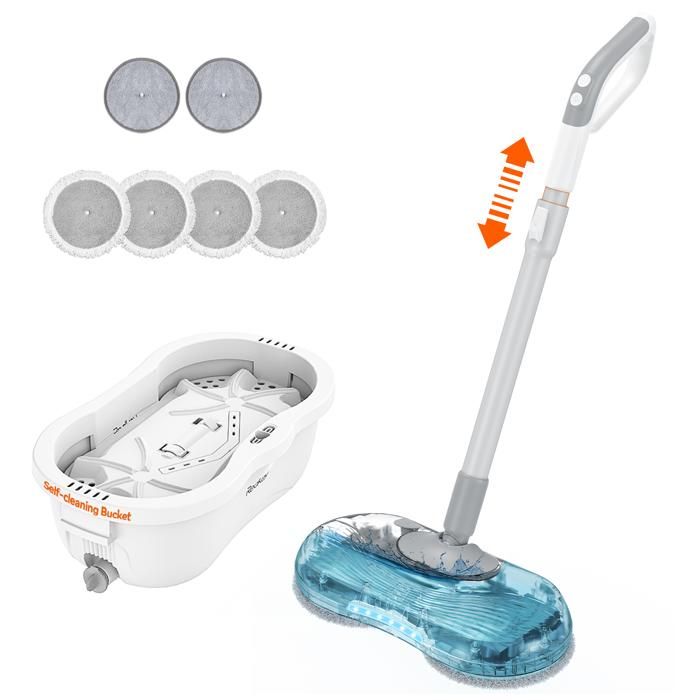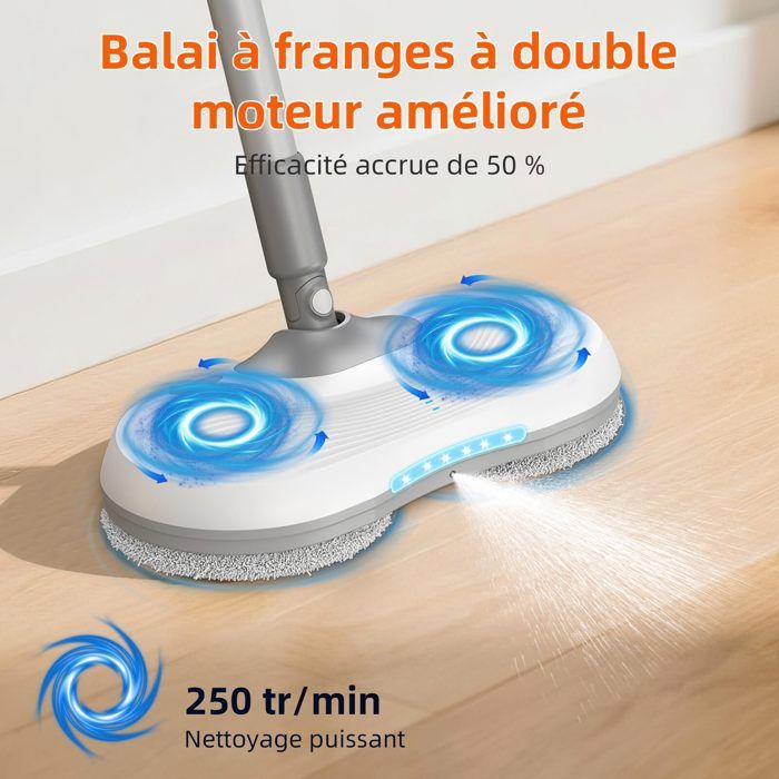 1. Nettoyage Puissant : Nos doubles têtes de vadrouille tournent à des vitesses élevées jusqu’à 250 tr/min, éliminant la poussière et les taches facilement et rapidement dans des directions opposées pour un nettoyage puissant qui élimine la crasse et la saleté.