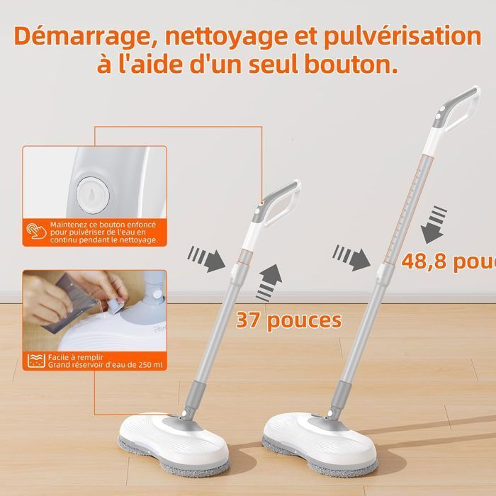 La vadrouille électrique Redkey peut être ajustée de 46 pouces à 35 pouces, ce qui répond aux besoins des personnes de différentes hauteurs pour utiliser confortablement la vadrouille électrique en toute simplicité. Pas de flexion, pas de mal de dos.