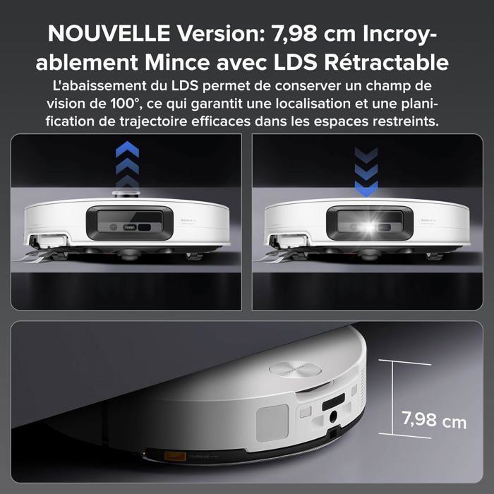 Un télémètre orienté vers le haut ajuste la hauteur du LDS pour assurer la fluidité de cartographie des zones offrant peu de hauteur, tandis que le capteur de contact supérieur détecte les obstacles en temps réel afin d’éviter que le robot ne force l’accès à certaines zones et ne raye des surfaces.