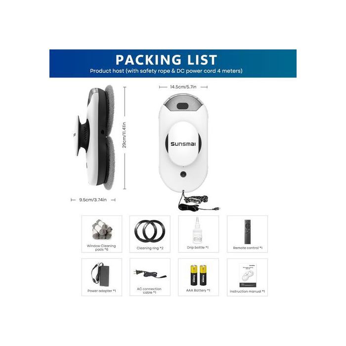 Dites adieu à la corvée du nettoyage des vitres avec le robot lave-vitres SUNSMAI W1! Conçu pour vous offrir confort, efficacité et une technologie de pointe, ce robot intelligent prend soin de vos fenêtres en toute autonomie, vous libérant ainsi du temps et de l’énergie. Sa conception légère et son utilisation intuitive rendent son maniement simple et agréable.Équipé d’un double jet d’eau, il pulvérise le liquide vers l’avant, humidifiant efficacement les saletés pour un nettoyage en profondeur. Ses trois modes de nettoyage intelligents et son système de détection des cadres et des obstacles garantissent une précision et une sécurité optimales. Grâce à son puissant moteur d’aspiration (jusqu’à 2800 Pa), le robot adhère fermement aux surfaces vitrées, assurant un nettoyage impeccable, sans traces ni coulures.Alimenté par une batterie rechargeable, il offre plusieurs heures d’autonomie, et son réservoir d’eau de 50 ml est suffisant pour une session de nettoyage complète. Idéal pour les maisons, les appartements et les bureaux, il est parfait pour tous ceux qui souhaitent profiter de fenêtres propres sans effort. Le SUNSMAI W1 est doté d’une navigation intelligente avec 3 modes de nettoyage et détection d’obstacles. Son aspiration puissante de 2800 Pa assure une adhérence parfaite aux vitres. Son alimentation sans fil offre une grande liberté d’utilisation. Profitez de vitres étincelantes, sans traces, sans stress et sans effort! Commandez le vôtre dès aujourd’hui et redécouvrez le plaisir d’une vue dégagée! Le robot SUNSMAI W1 est l’allié idéal pour un entretien quotidien facile et efficace.