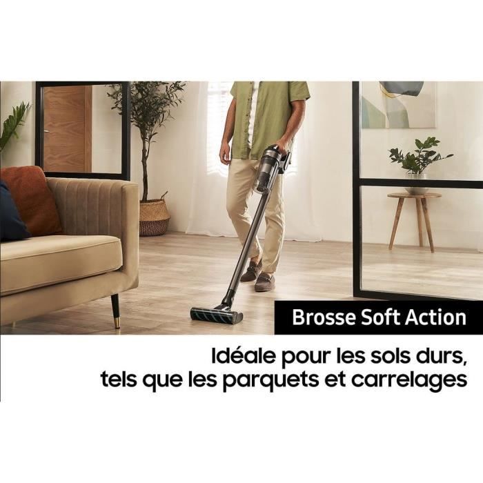 Nom du produit SAMSUNG Jet 75E Complete VS20B75CR5 – Aspirateur Balai sans Fil – Puissance 200 AW – Autonomie 60 min – Station murale – 3 brosses