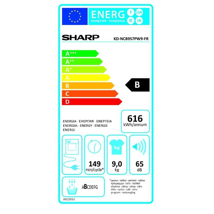 Nom du produit Sèche-Linge Frontal à Condensation – SHARP KDNCB9S7PW9 – Capacité 9kg – Classe B – Consommation 616 kWh