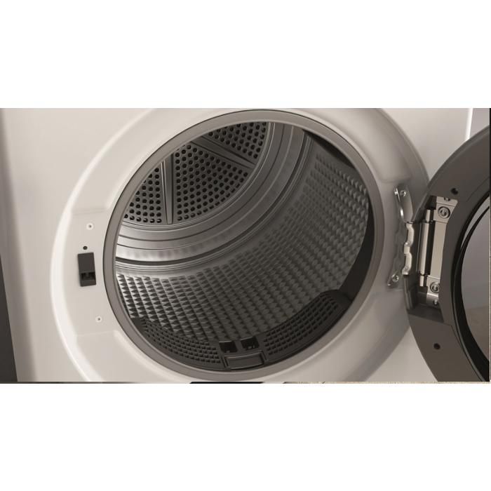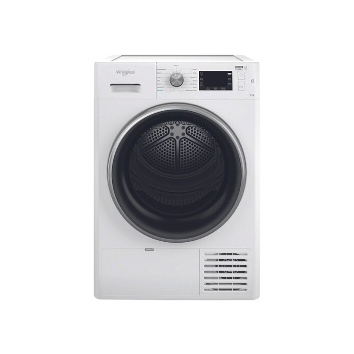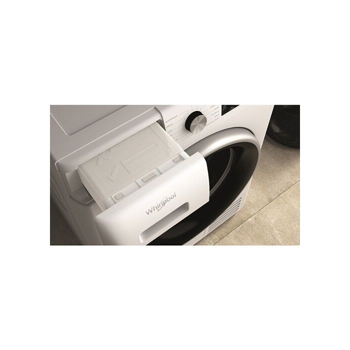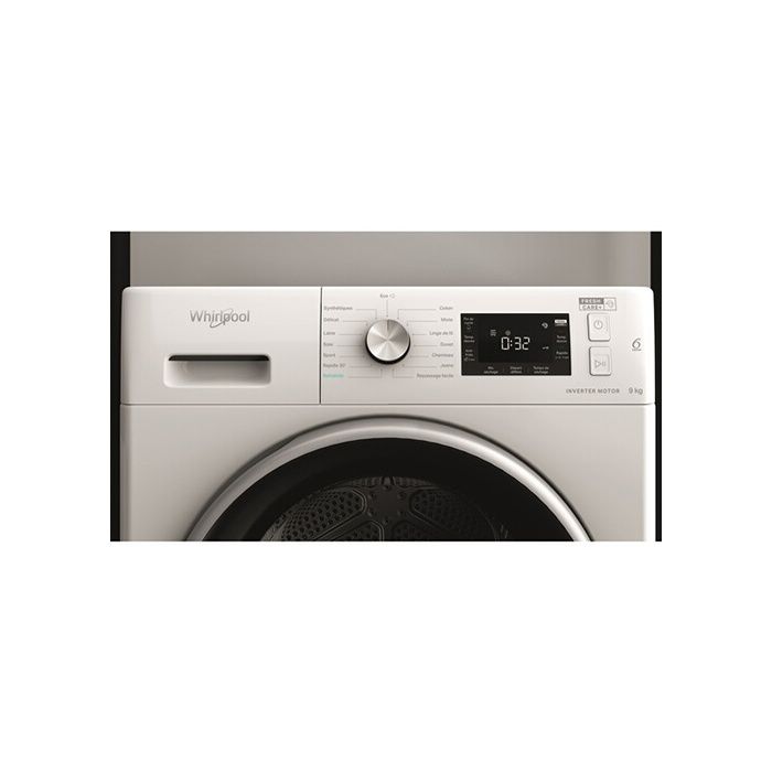 Le sèche-linge frontal Whirlpool FFTDN M22 9X2BS FR blanc, d’une capacité de 9 kg, est doté de 15 programmes, d’un système pompe à chaleur qui vous permet de réaliser des économies d’énergie, d’un programmateur intelligent 6ème Sens : le soin idéal pour votre linge et d’un système Easy-Cleaning. Profitez de plus d’espace pour un meilleur séchage grâce à son grand volume de tambour de 120 litres. Basse consommation, ce sèche-linge pompe à chaleur bénéficie d’une classe énergétique A++. Pompe à chaleur Le système de pompe à chaleur fonctionne en circuit fermé et transforme, sans résistance de chauffage l’air froid présent dans l’appareil en chaleur nécessaire pour chauffer le linge. L’énergie consommée est ainsi réduite au minimum. Un témoin vous indique lorsqu’il faut nettoyer le filtre de porte et de socle. 6ème Sens La technologie exclusive 6ème Sens gère et adapte automatiquement la température et l’humidité à l’intérieur du tambour pour un séchage tout en douceur, vous permettant ainsi de faire des économies de temps et d’énergie. Système Easy-Cleaning Un nettoyage du filtre du condenseur facilité ! Ce système permet un nettoyage du filtre de la partie condenseur plus facile et plus rapide. Option Fresh Care+ Plus d’urgence à sortir votre linge ! Votre linge reste frais jusqu’à 6 heures après la fin du cycle. Grâce au contrôle intelligent de la température et à un brassage doux, le système FreshCare+ préserve la fraîcheur de votre linge après la fin du cycle. Programme Mixte Permet de sécher coton et synthétique en même temps. Programme Laine Ce cycle rapide permet de sécher vos vêtements en laine de manière uniforme à seulement 45-50°C. De plus, vous n’avez pas besoin d’utiliser de panier à laine ce qui libère de l’espace pour vos vêtements. Programme Rafraîchir Il donne un coup de frais à vos vêtements, ainsi le linge resté longtemps dans votre armoire est rafraîchi en un temps record. Départ différéProgrammez votre sèche-linge pour profiter du tarif heures creuses (selon abonnement) grâce au départ différé. Indicateur du temps restant Il vous permet de visualiser le temps qu’il reste avant que le programme se termine. Pour votre sécurité ce sèche linge bénéficie d’un verrouillage enfant et des voyants suivants : nettoyage filtre de porte, réservoir plein, indicateur des phases de cycle et panne.
