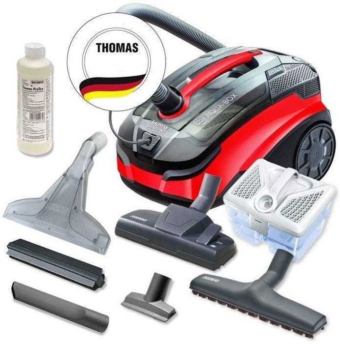 L’aspirateur Thomas vous permet de nettoyer les tapis et les moquettes, les sols durs et les meubles. Un produit Thomas exclusif qui révèle des possibilités insoupçonnées dans le nettoyage quotidien de la poussière. Il s’agit d’un aspirateur de haute qualité, doté de technologies de pointe, qui facilite et accélère le nettoyage de diverses surfaces. En mode sec, il aspire hygiéniquement la poussière sèche, car la poussière est collectée dans un filtre à eau. L’aspirateur est un collecteur fiable de petites quantités d’eau. Utilisé pour le nettoyage des tapis, des sols durs et des meubles rembourrés. Vous serez convaincu de sa très haute qualité. Thomas est conçu pour la récupération de liquides, le nettoyage humide et l’aspiration sèche, à l’aide d’un système de filtration à eau. L’aspirateur Thomas est très populaire en Europe. Très puissant, lors de l’aspiration, 99,99% de la poussière reste dans le réservoir. La maison reste propre, l’air y est frais et il n’y a pas d’odeur désagréable. Le filtre HEPA lavable ne perd pas ses propriétés avec le temps et reste efficace pendant de nombreuses années. Si le filtre est sale, il suffit de le rincer sous l’eau et il est comme neuf. Thomas est un aspirateur de qualité supérieure qui durera plus longtemps que la garantie de deux ans qui lui est accordée. Caractéristiques techniques Buse de nettoyage à sec Parquet, tapis, meubles rembourrés, fissures, Buse de lavage Lavage de tapis avec adaptateur pour sols durs Portée (m) 9 m Puissance d’aspiration (W) 320 W Puissance (W) 1600 W Longueur du cordon (m) 6 m Poids (kg) 8,2 kg LxHxP 48,60×31,80×30,60 cm Réservoir de produit nettoyant pulvérisé (l) 1.8 l Quantité d’eau aspirée (l) 2 l Couleur rouge/noir Système de