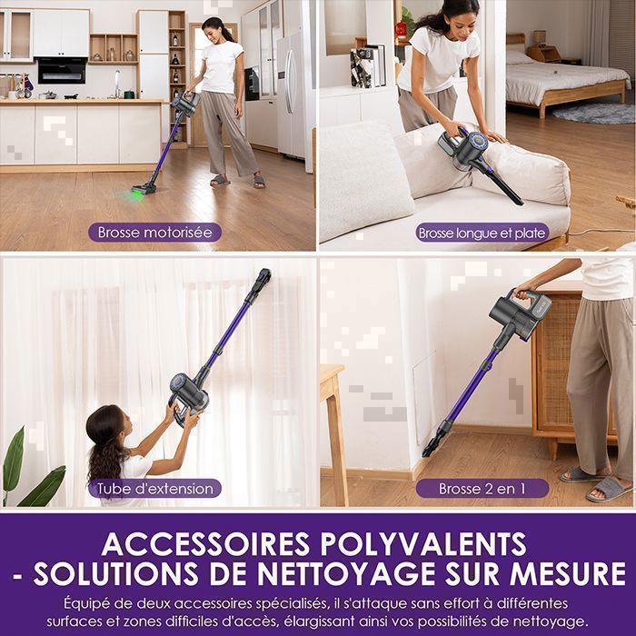 • ACCESSOIRES POLYVALENTS & NETTOYAGE COMPLET : Avec ses brosses adaptées, il s’utilise sur sols, tapis, canapés, rideaux et plafonds, offrant un nettoyage efficace et complet.
