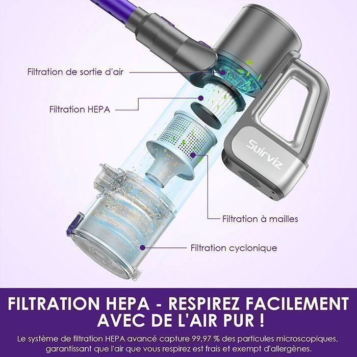 【Système de Filtration Avancé】 Le filtre multi-niveaux HEPA capture 99,97 % des particules fines, empêchant la poussière et les allergènes de se disperser. Il purifie l’air en retenant les impuretés et en libérant un air frais et sain.