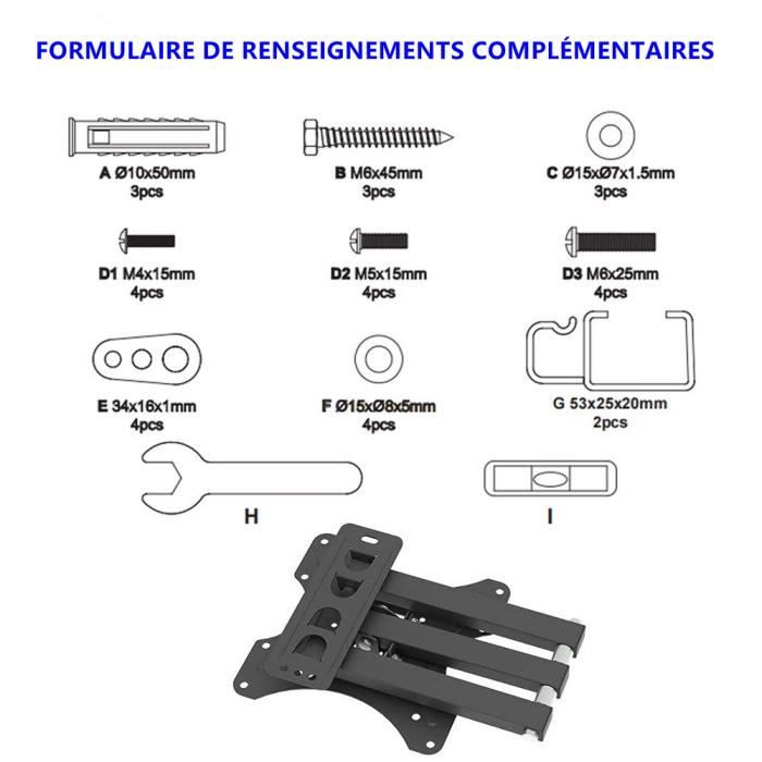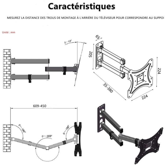 Taille d’écran prise en charge: (26-55) “”/ (66.04-139.7) cm Plage d’inclinaison: -5 ~ 12 ° Modèle de montage VESA maximum: 200 x 200 mm Distance entre le téléviseur et le mur: 60 mm-450 mm Capacité de charge: 66lb / 30kg Matériel: Plaque