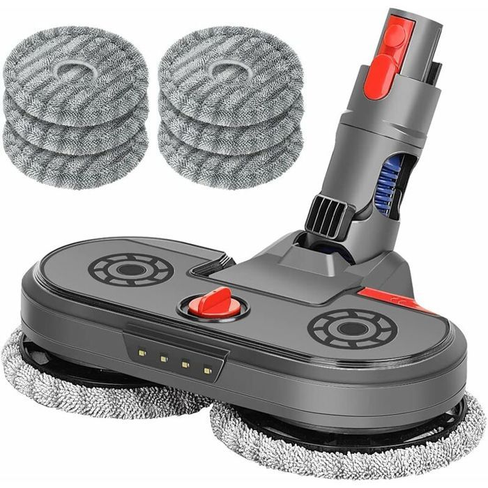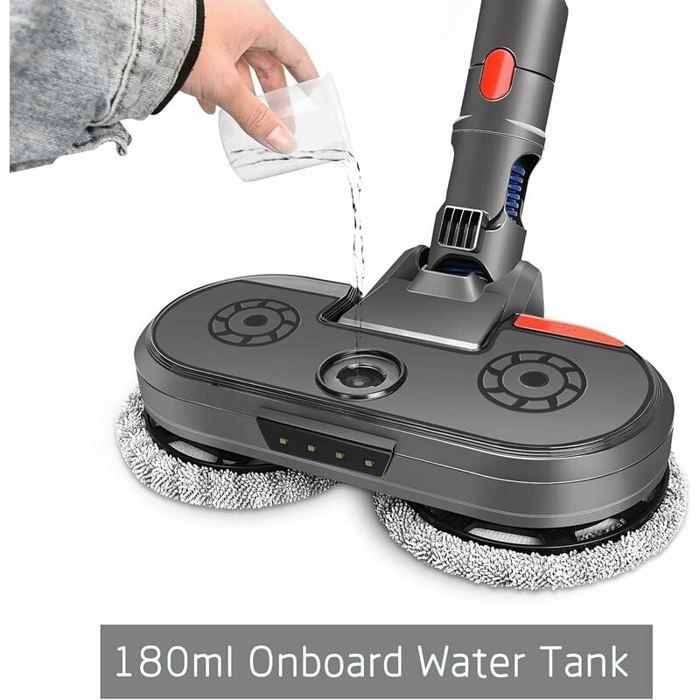 Compatibilité parfaite – La tête de vadrouille électrique est compatible avec l’aspirateur sans fil Dyson V15 V11 V10 V8 V7 Animal / Absolute / Outsize / Fluffy / MotorheadMultifonctionnel : remplacez la tête de brosse de nettoyage pour aspirer pendant le nettoyage, vous pouvez éliminer efficacement les taches en une seule étape. Et cet accessoire de brosse à tête de vadrouille peut également être poli et ciréTête de vadrouille rotative double – La brosse rotative électrique est conçue avec 2 puissants moteurs doubles avec une vitesse de 170 tr/min, qui peuvent continuer à nettoyer le sol et éliminer efficacement les tachesRéservoir d’eau intégré – cet accessoire de vadrouille électrique avec réservoir d’eau intégré et vadrouille humide intégrée peut automatiquement pulvériser de l’eau sans laisser de taches d’eauLumière LED avant – La brosse à sol est équipée d’une lumière LED, ce qui facilite le nettoyage de la maison même dans les coins sombresDescription du produitLire la suiteEssuyer et aspirer* Nettoyage en une étapearticulation rotative à 140°* Plus pratique pour nettoyer n’importe quel coinRéservoir d’eau intégré* Ajouter de l’eau ou du détergent pour un meilleur effet de nettoyageLire la suiteLumière LED avant* Nettoyez facilement les coins cachés et la saletéTête de brosse rotative double* Nettoyer vigoureusement les orduresChiffon lavable* Lavable en machine et réutilisableLire la suiteTête de balai électrique Dyson* Compatible avec Dyson V7 V8 V10 V11 V15 Animal / Absolute / Outsize / Fluffy / Detect / Motorhead / Torque Drive Extra aspirateur sans fil (Remarque : non applicable aux séries V6 et DC)* Vitesse : 170 tr/min* Contenu de l’emballage : 1 * tête de vadrouille électrique, 6 * tampon de vadrouille,Lire la suite