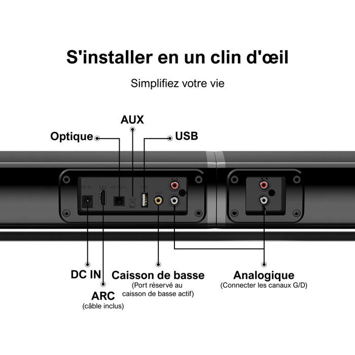 Connexion Filaire + Sans Fil : La barre de son est équipée de ports ARC, optique, AUX et USB (tous les câbles sont inclus)