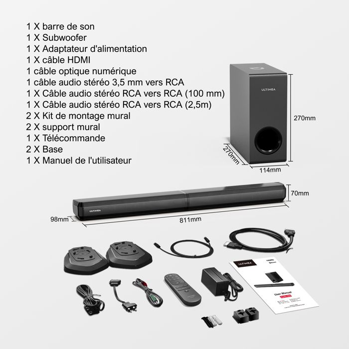 • 1 x Barre de son / 2 x Base / 1 x Adaptateur secteur;