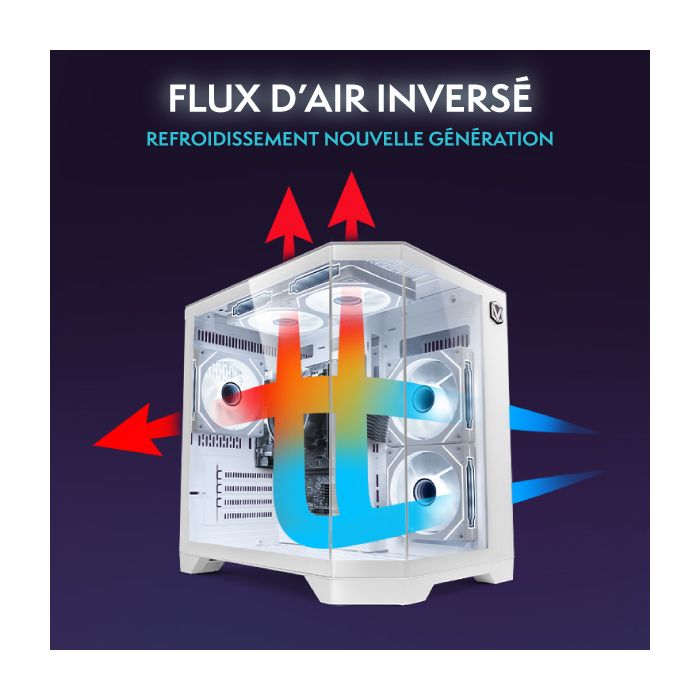 Les ventilateurs hexagonaux haute performance Vibox améliorent le flux d’air tout en offrant un superbe effet lumineux miroir infini. Personnalisez votre configuration avec plusieurs modes et couleurs RVB pour une expérience de jeu dynamique et unique.