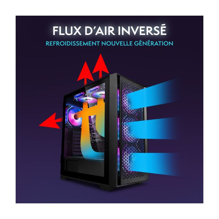 | Caractéristiques | Conception compacte | Panneau avant à effet miroir infini | Flux d’air exceptionnel | Conception compacte en verre | Superbe RGB, vue complète des composants |