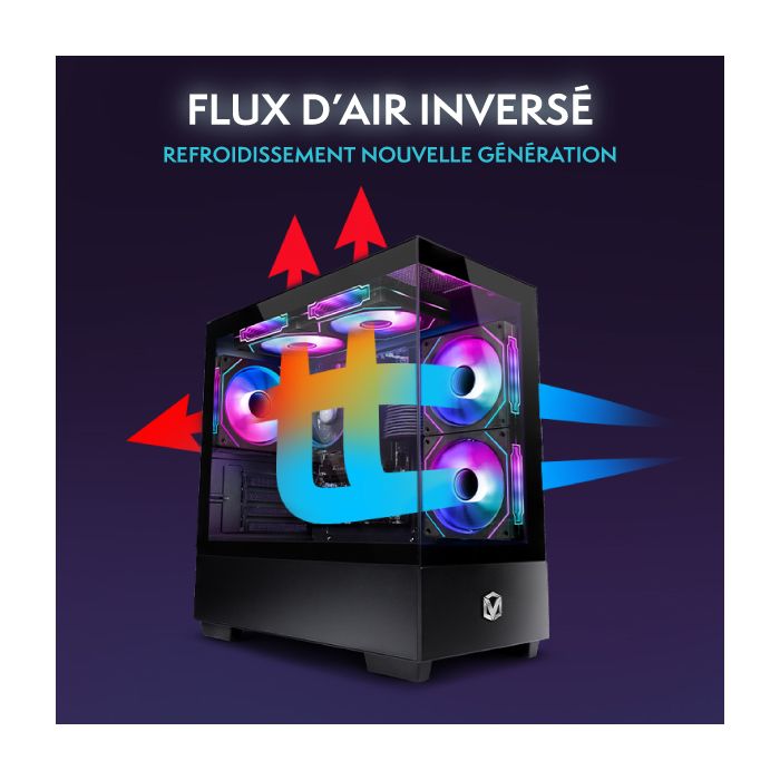 Caractéristiques Conception compacte Panneau avant à effet miroir infini Flux d’air exceptionnel Conception compacte en verre Superbe RGB, vue complète des composants