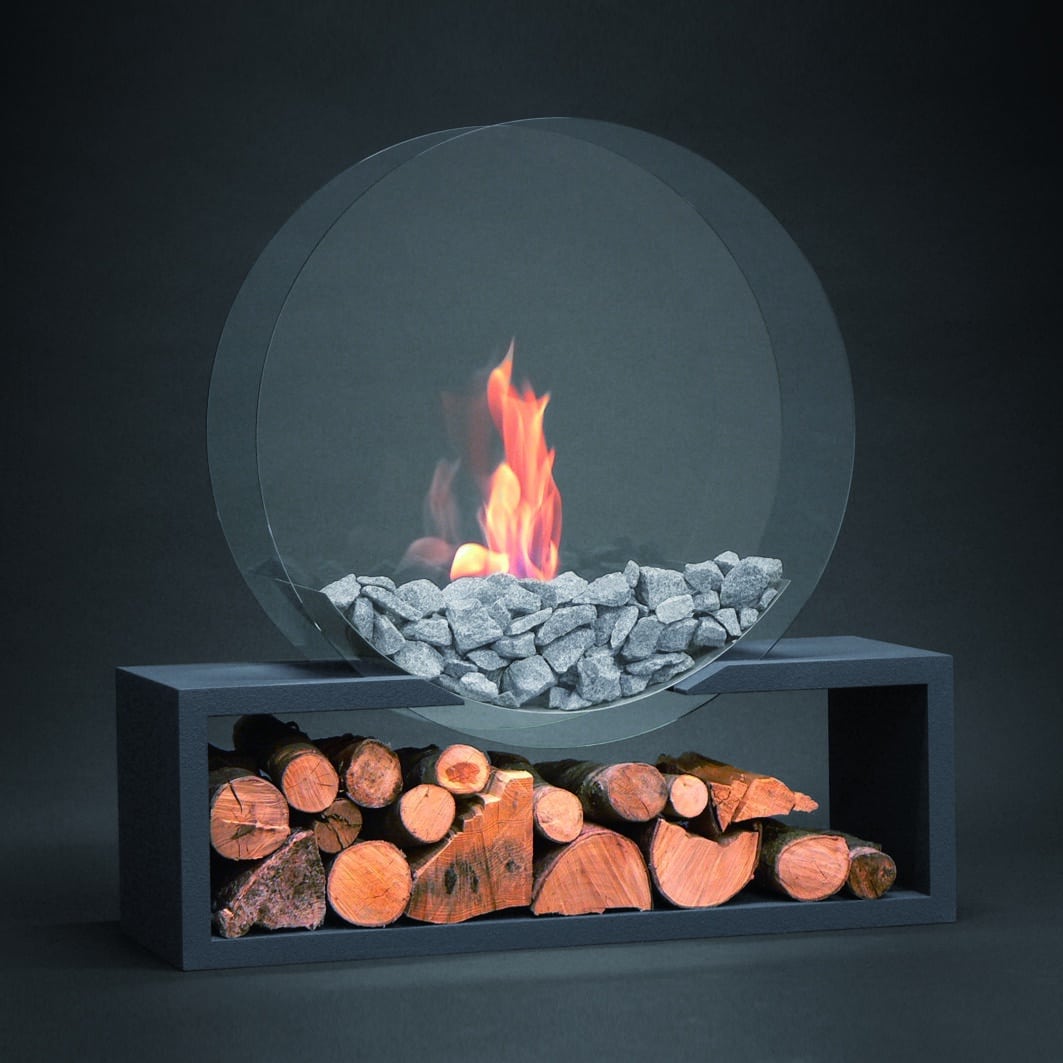 • Cheminée au design élégant avec une base en MDF gris souris et 2 vitres rondes au milieu desquelles sont posées des pierres grises.